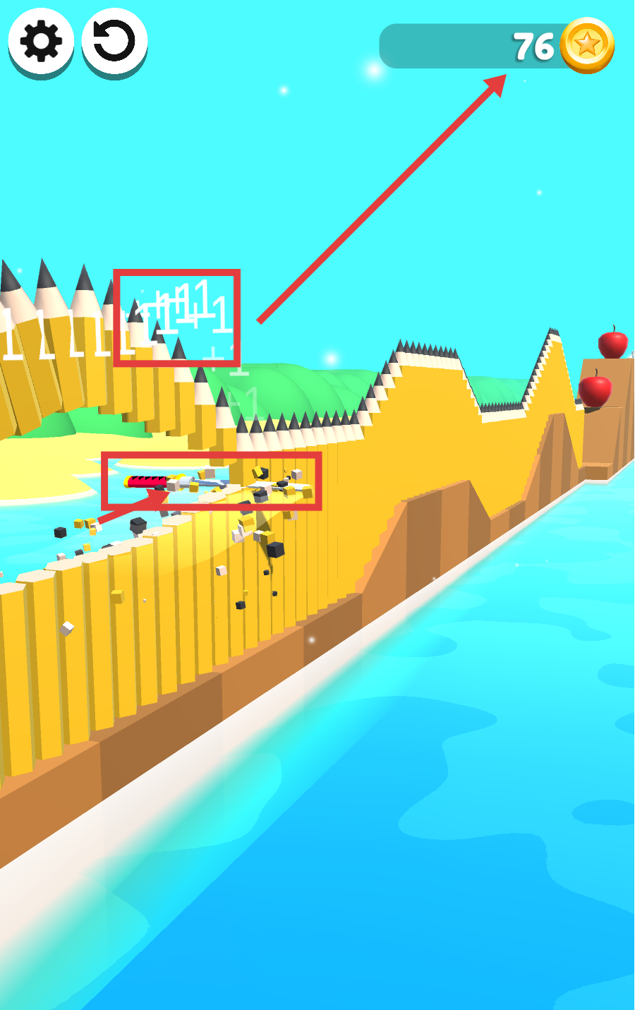 2、闯关时持续破坏铅笔状等黄色障碍物,留意上方分数变化,边积累分数边清理路径。