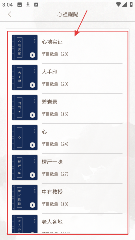 2、在“心祖醍醐”页面,有【心地实证】【大手印】等多个节目,选感兴趣的节目,进入详情页。
