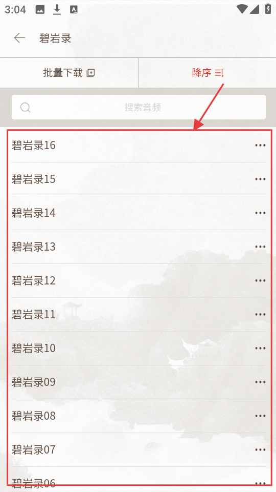 3、进入【碧岩录】页面,有碧岩录16、15等音频,可按降序排列查看,选要听的音频,进入播放页。