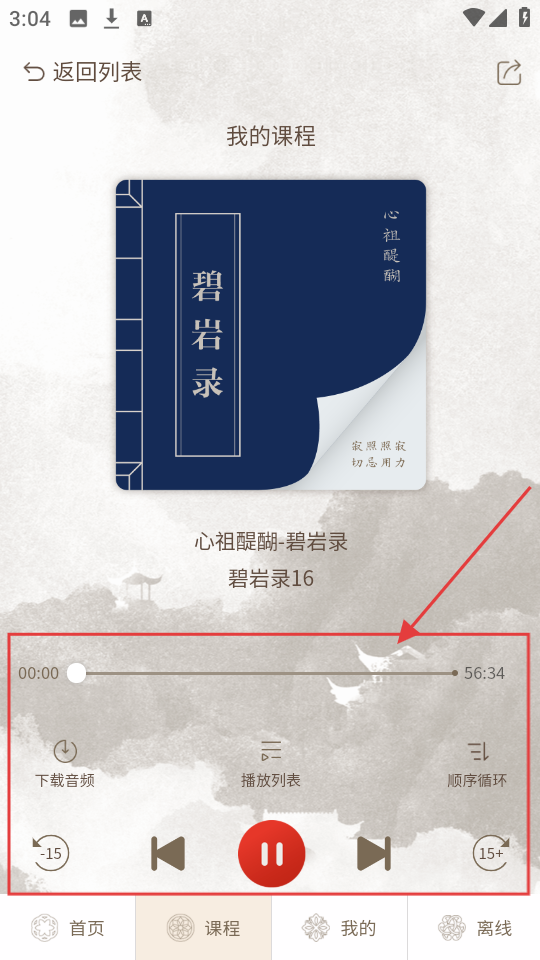 4、在课程播放页,能播放碧岩录音频,还可下载音频、调整播放列表、设置循环模式,按需操作。