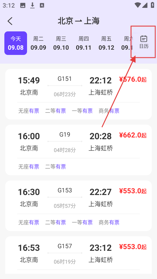 2、在车次列表页,能看到当天车次信息,点【日历】,可切换日期,查看其他日期的车次。