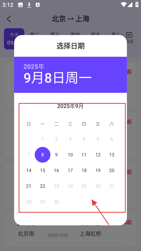3、进入选择日期弹窗,有2025年9月日历,选要查询的日期,确定后,查看对应日期的车次。