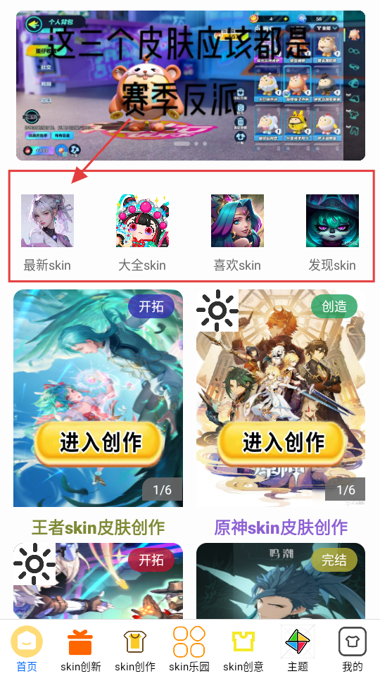 1、进入首页,有【最新skin】【大全skin】等分类,还有王者、原神等皮肤创作入口,选感兴趣的分类或创作入口。