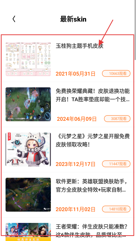 2、在【最新skin】页面,有【玉桂狗主题手机皮肤】等内容,选感兴趣的皮肤内容,查看详情,了解皮肤相关信息。