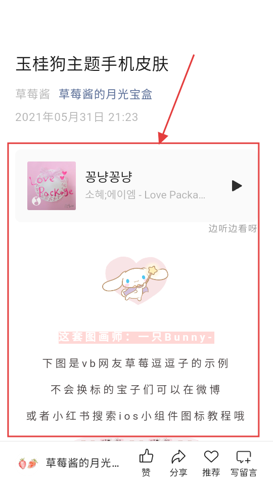 3、进入【玉桂狗主题手机皮肤】详情页,可看皮肤展示、画师等信息,还能边听音乐边浏览,深入了解皮肤。