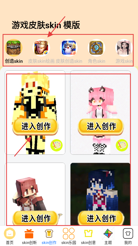4、在游戏皮肤skin模版页,有【创造skin】等分类和多个皮肤创作入口,选要创作的皮肤类型,点【进入创作】,开始皮肤创作。