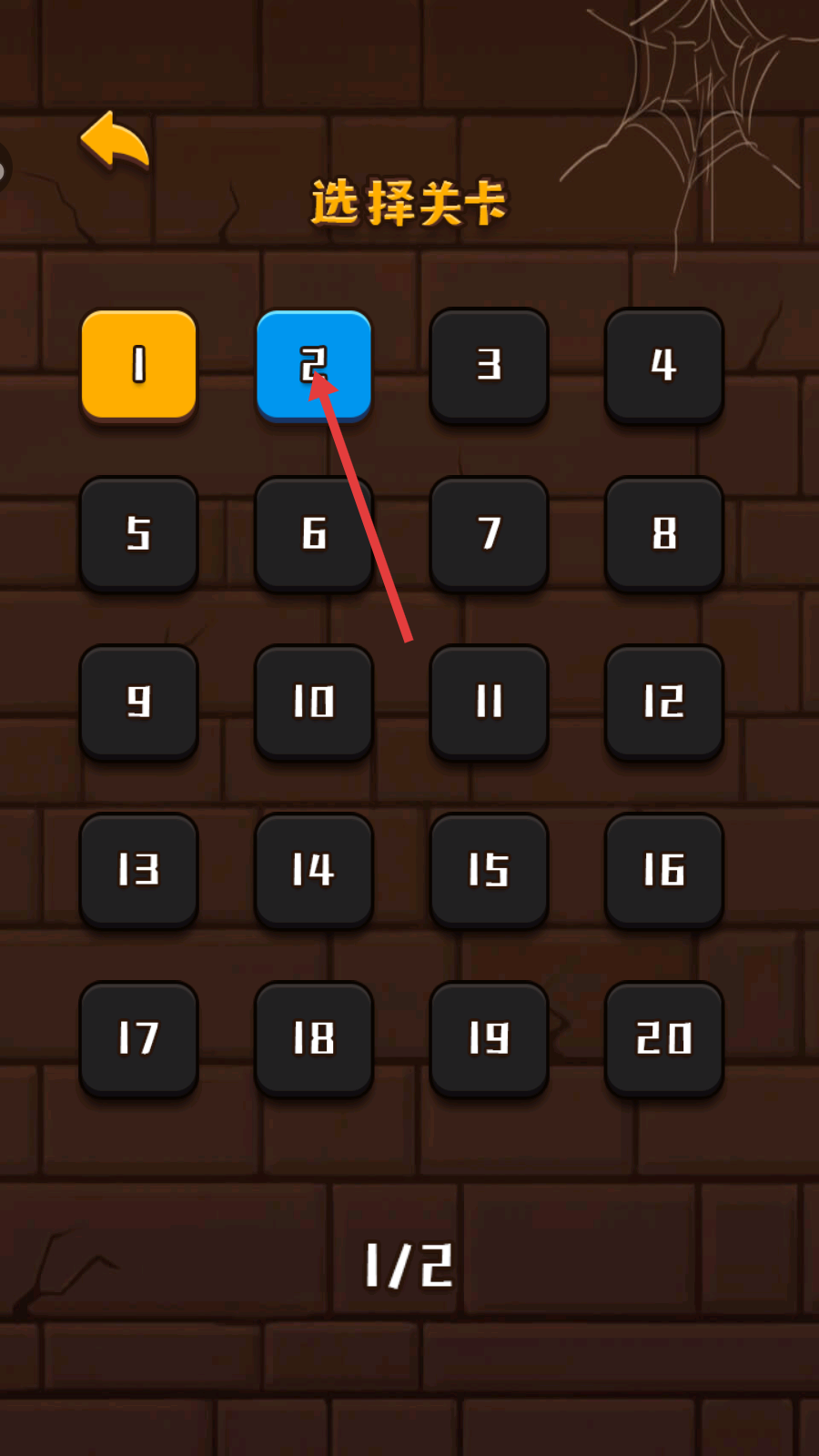 1、在【选择关卡】界面,点击蓝色的【2】按钮,即可进入关卡2开启挑战,后续还能逐步解锁更多关卡。