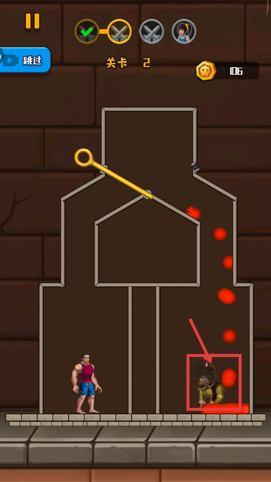 3、拉开右侧金色拉环,使红色液体顺着通道流下,让液体精准落在绿色怪物身上,从而消灭怪物。