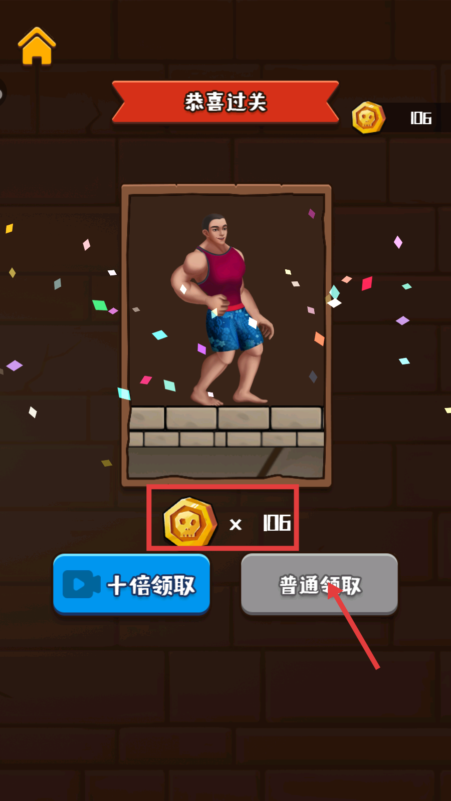 4、成功消灭怪物通关后,界面会显示【恭喜过关】,可点击【普通领取】获取106枚金币,也能选十倍领取得更多奖励。