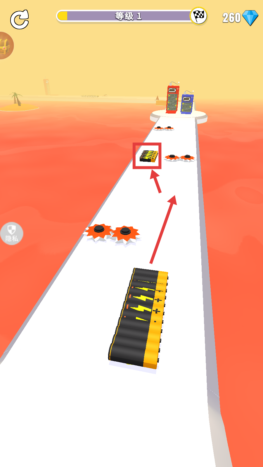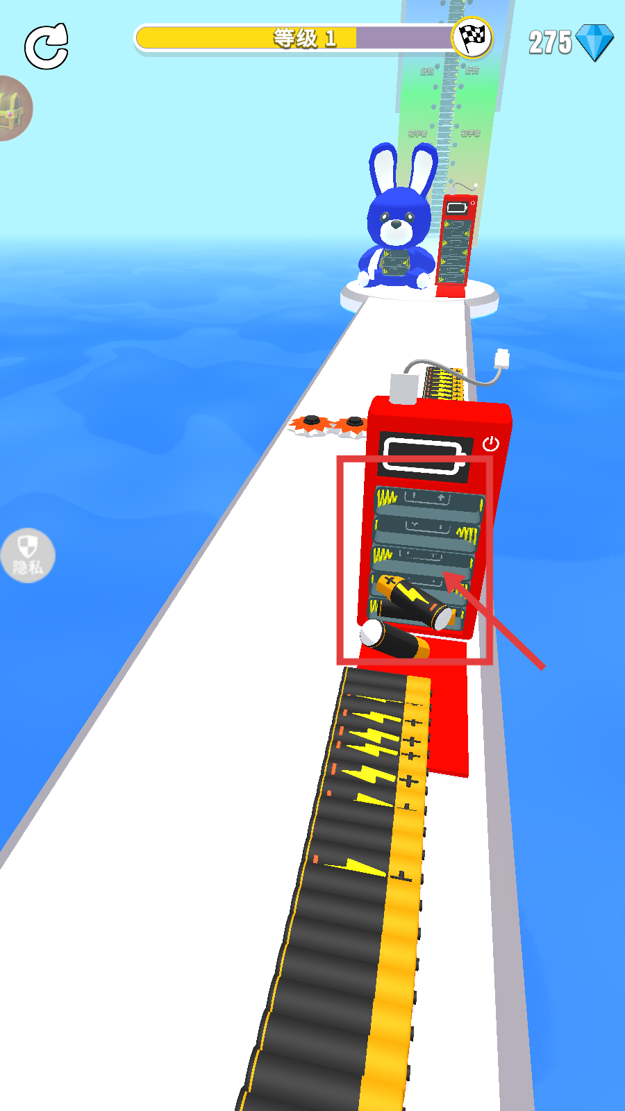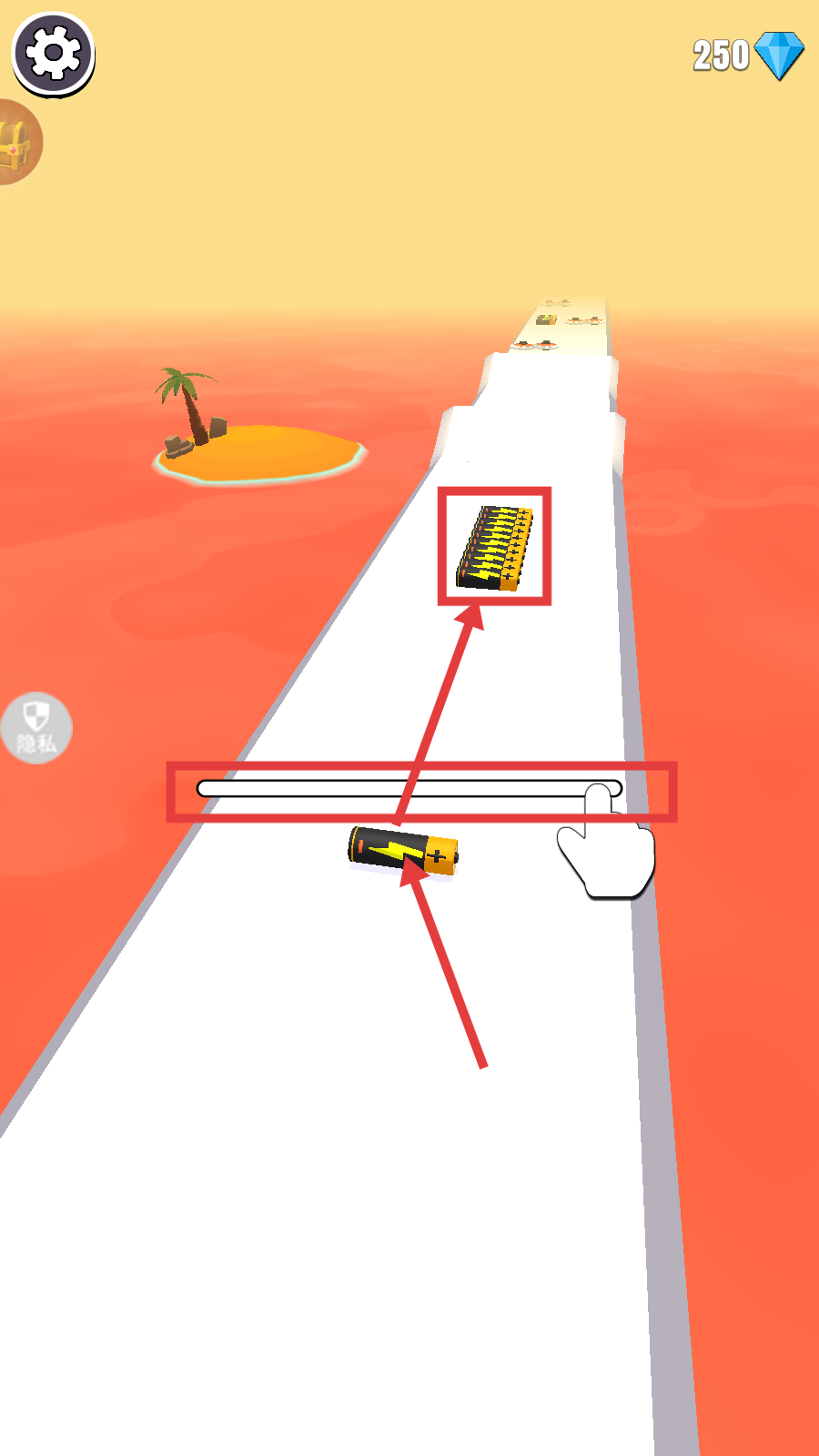 1、关卡开始时,按照提示滑动屏幕,收集赛道上的电池,让单个电池逐步组合成电池组,为后续推进做准备。