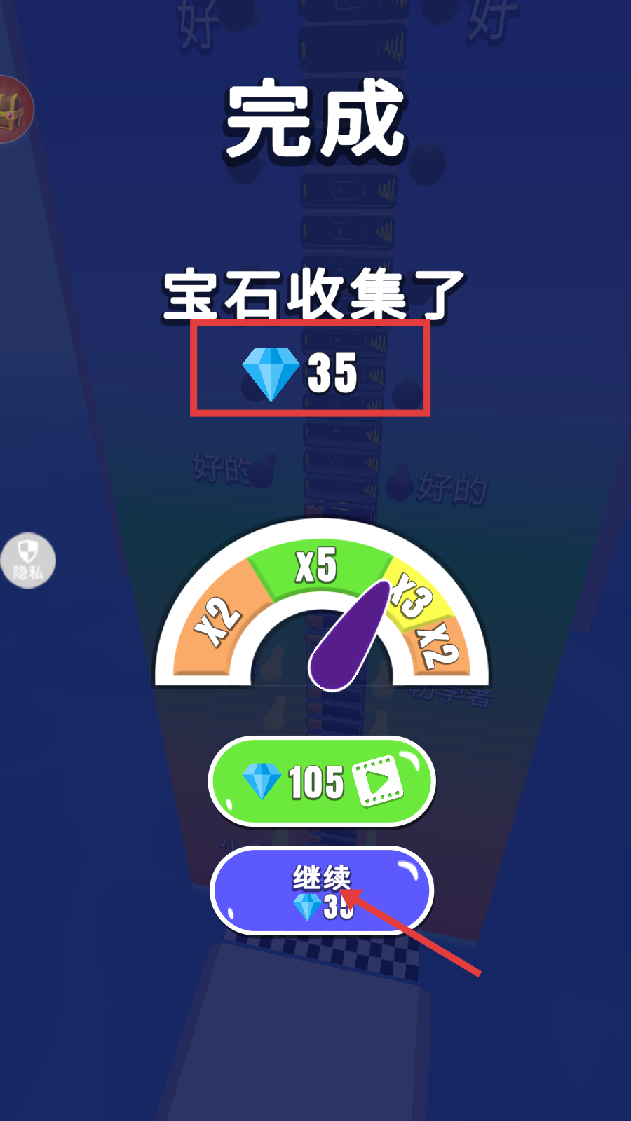 4、通关后会显示【完成】,可获得35颗宝石,若想继续下一关,点击【继续】按钮即可,也能选择看视频翻倍获取宝石。