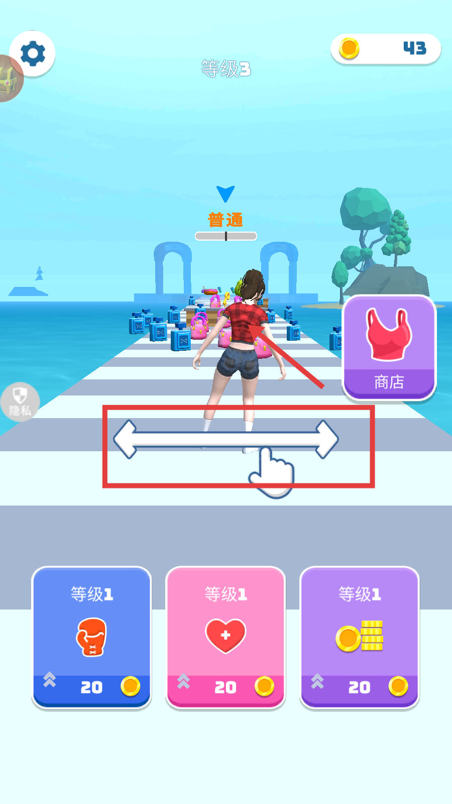 1、进入【等级3】,通过左右滑动屏幕操控角色,可前往【商店】升级装备,也能用金币提升拳击、生命等属性。