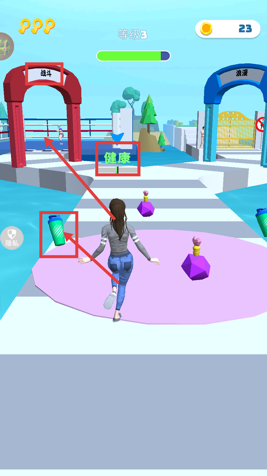 2、在赛道上收集【绿色水杯】等道具提升【健康】值,朝着标有【战斗】的拱门前进,为格斗环节做准备。