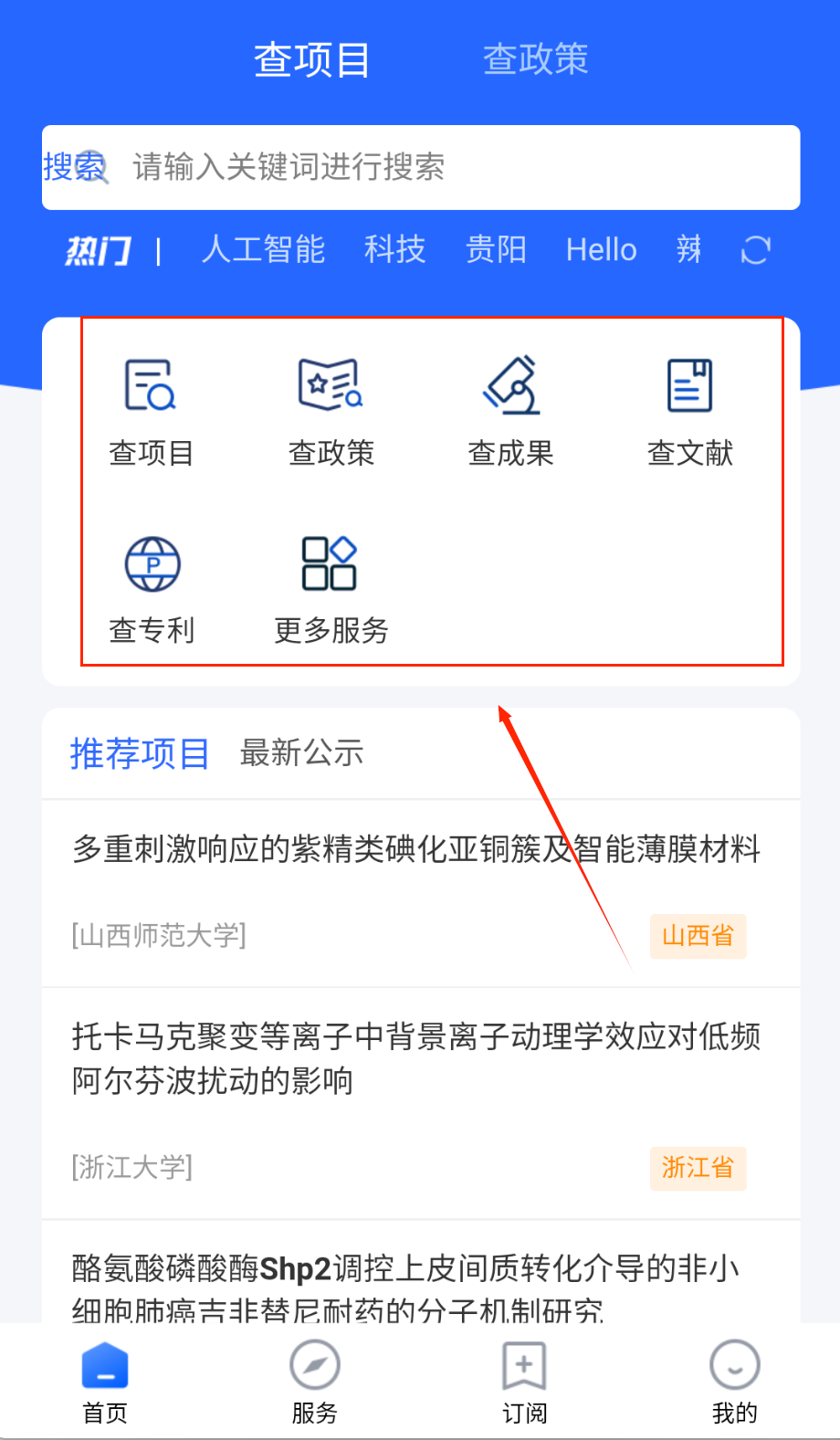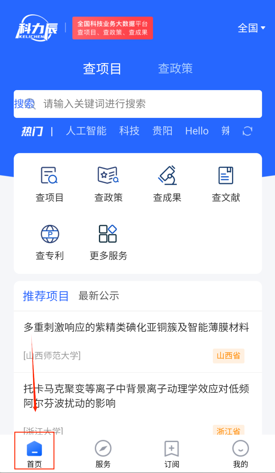 1、注册登录后进入首页选择查询类型,包括科技项目、政策文件、研究成果等六大类别,点击相应图标进入专业查询界面。