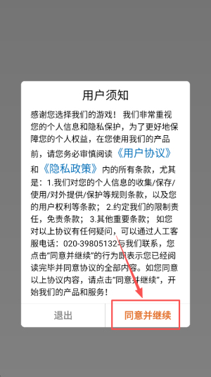 1、首先,阅读并同意用户须知,点击“同意并继续”按钮以进入游戏。