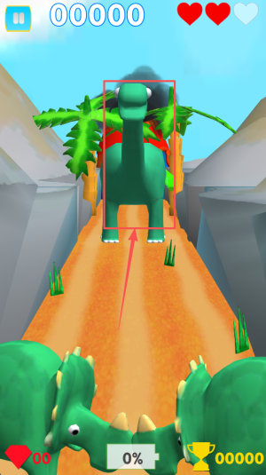 2、接着,控制恐龙角色在道路上奔跑,避开障碍物,收集金币。
