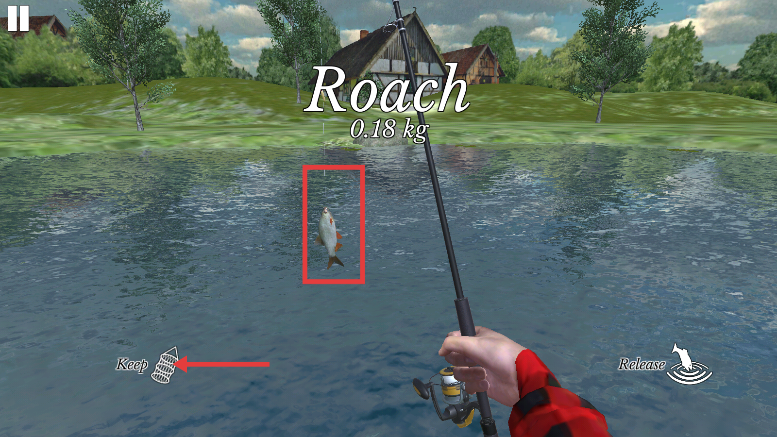 4、成功钓到鱼后,屏幕会显示鱼的种类【Roach】和重量,若要保留这条鱼,点击左侧【Keep】选项即可。