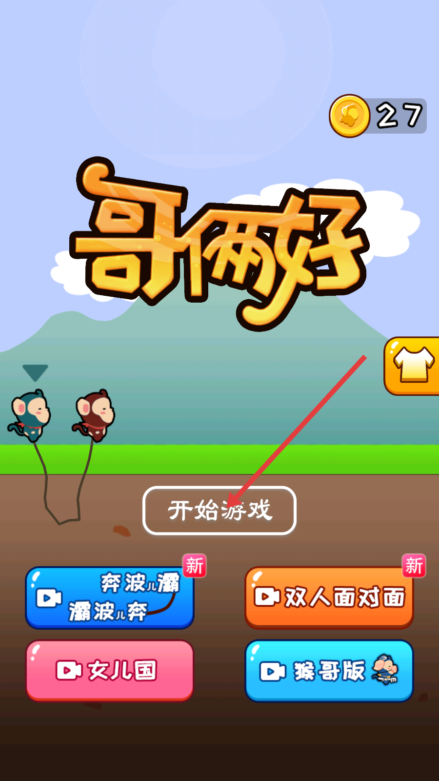 1、进入游戏后,点击【开始游戏】按钮,开启“哥俩好”的冒险,准备与猴子伙伴一同挑战。