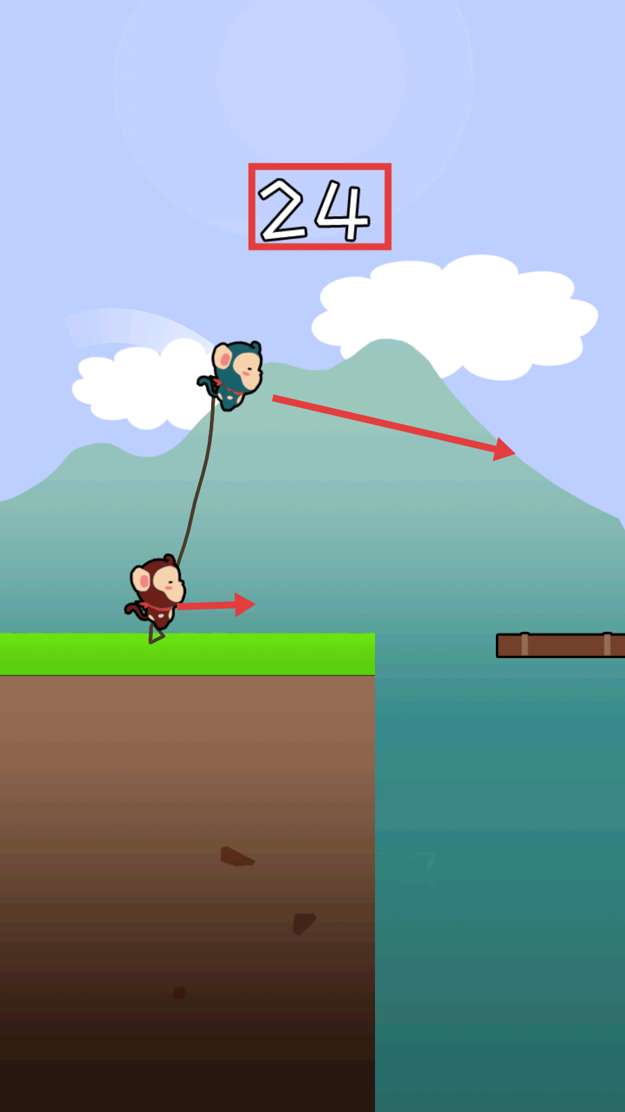 2、挑战过程中,控制猴子向右移动时,留意上方【24】的数字变化,借助绳索让另一只猴子也朝目标方向前进,配合通过地形。