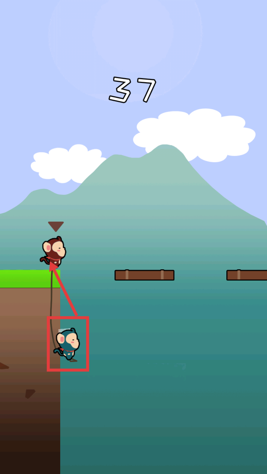 3、当猴子处于下方位置时,利用绳索机制让上方猴子带动它移动,同时关注上方【37】的数字进度,推进关卡。