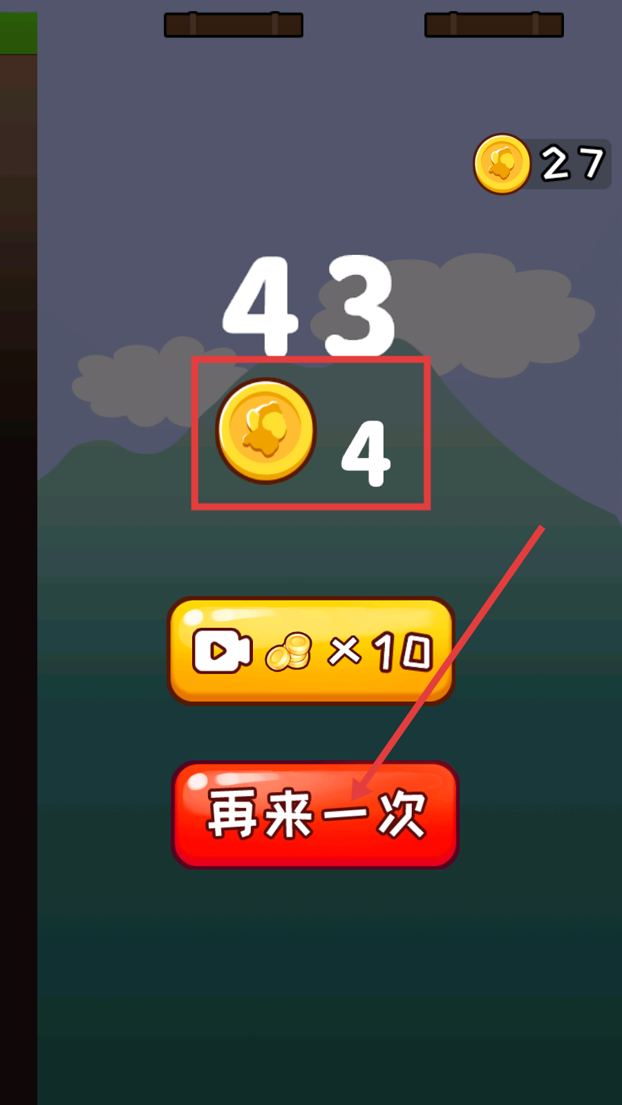 4、关卡结束后,会显示获得的【4】枚金币,若想重新挑战,点击【再来一次】按钮,继续与猴子伙伴闯关。