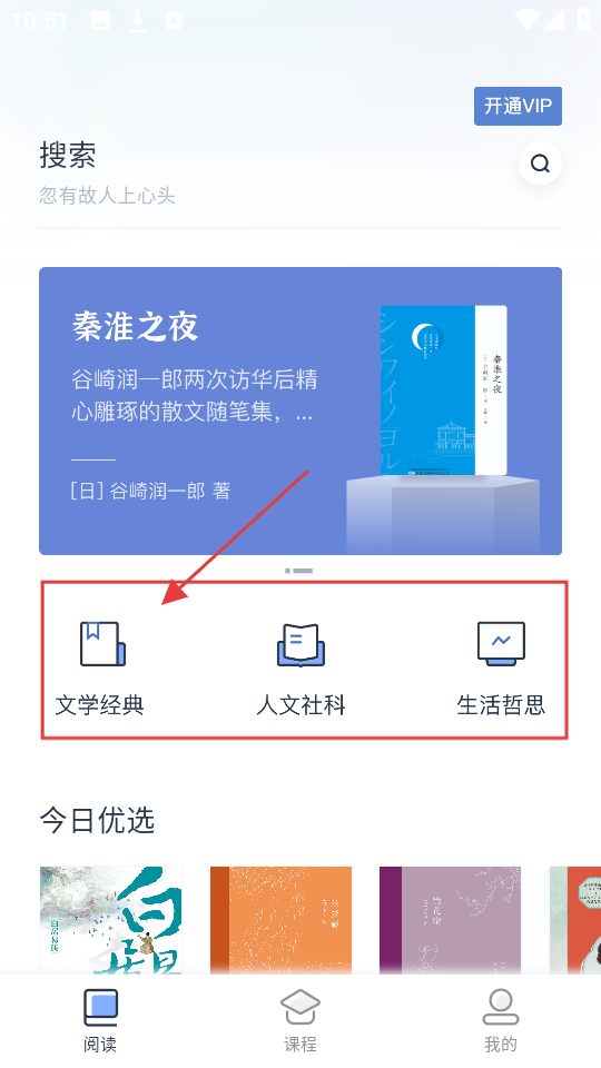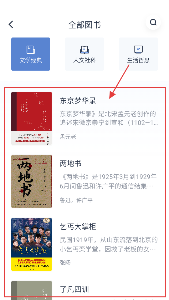 1、进入阅读页,有【文学经典】【人文社科】等分类,选感兴趣的分类,进入对应图书列表页。