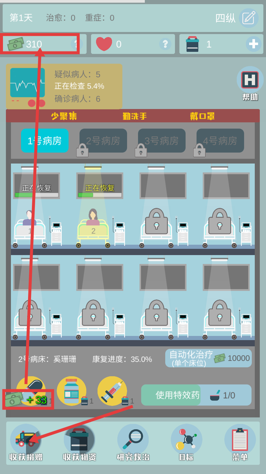 1、点击【收获捐赠】,获取【+33】资金,积累初始资金,为病房运营和后续操作做准备。