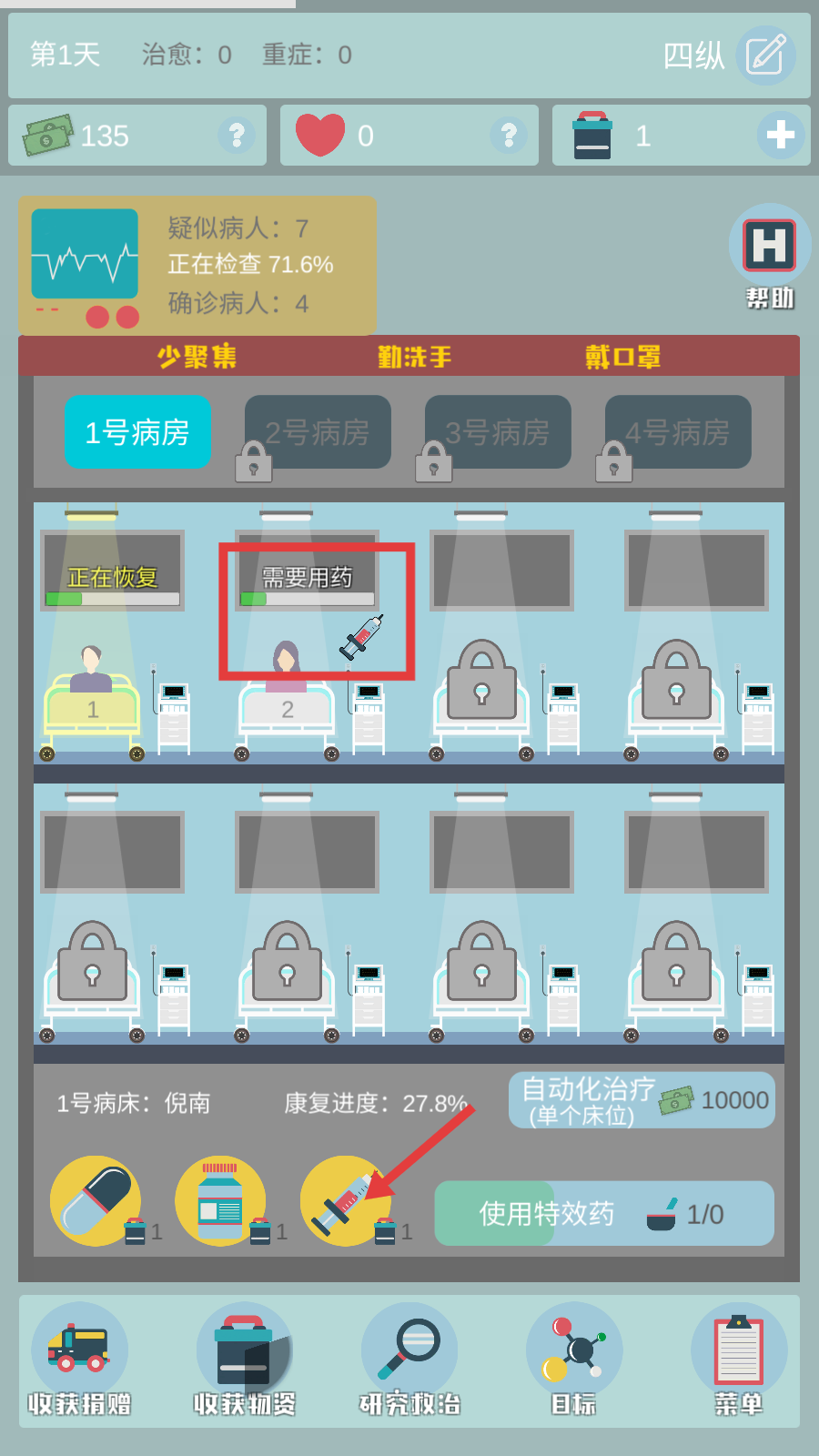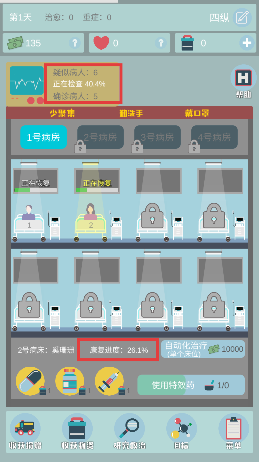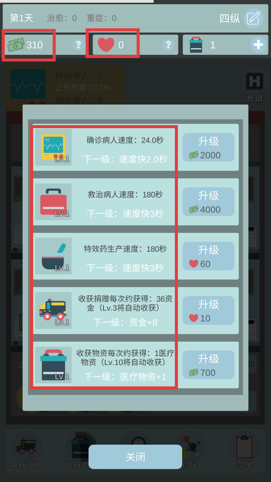 2、利用资金或爱心,升级【确诊病人速度】【救治病人速度】等项目,提升医疗流程的效率。