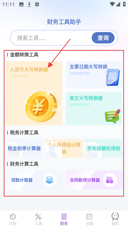 1、进入财务页,有【金额转换工具】【税务计算工具】等,选【人民币大写转换器】,进入转换页面。