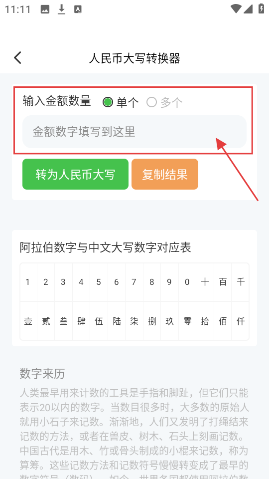 2、在人民币大写转换器页,选金额数量类型,在输入框填写金额数字,准备进行大写转换。