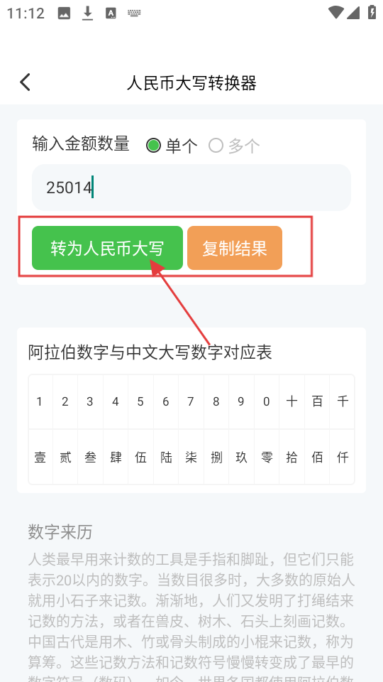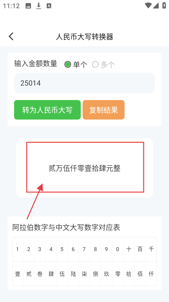4、转换完成后,页面显示人民币大写结果,可查看转换后的内容,若需使用,可进行复制等操作。