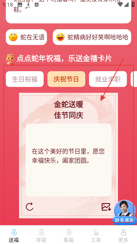 1、进入送福页,有【生日祝福】【庆祝节日】等分类,选【庆祝节日】,可发送节日祝福卡片,传递美好祝愿。
