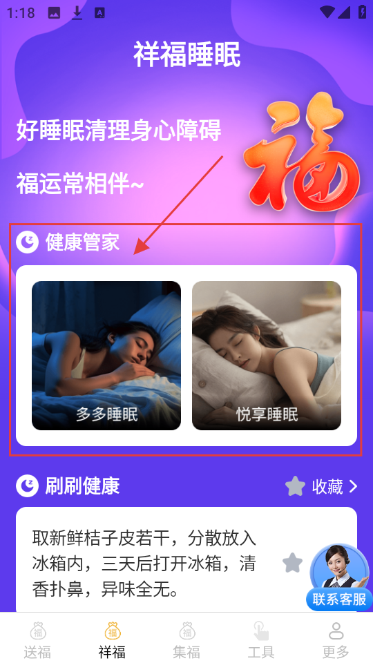 2、进入祥福页,有【健康管家】板块,含【多多睡眠】【悦享睡眠】等,选【多多睡眠】,了解睡眠相关内容。