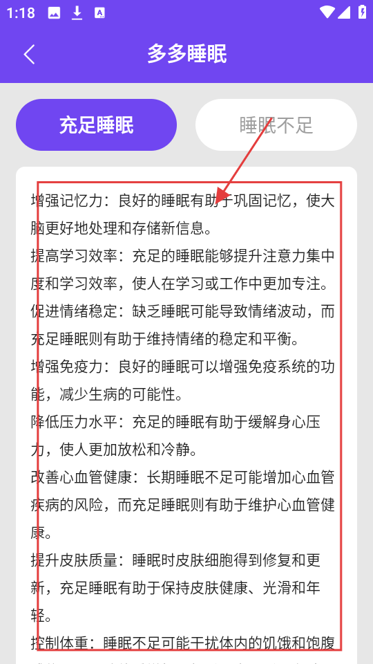 3、在多多睡眠页,选【充足睡眠】,可查看充足睡眠对增强记忆力、提高学习效率等多方面的益处。