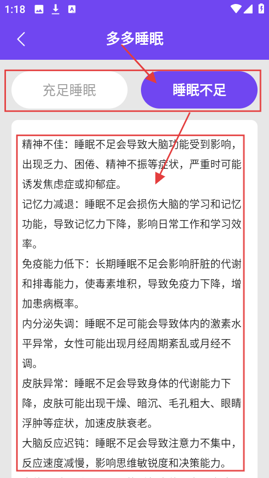 4、选【睡眠不足】,能了解睡眠不足会导致精神不佳、记忆力减退等多种不良影响,重视睡眠健康。