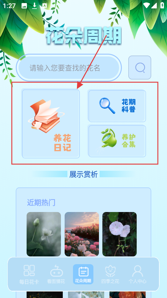4、进入花朵周期页,有【养花日记】【花期科普】等功能,选感兴趣的功能,如【养花日记】,记录养花日常。