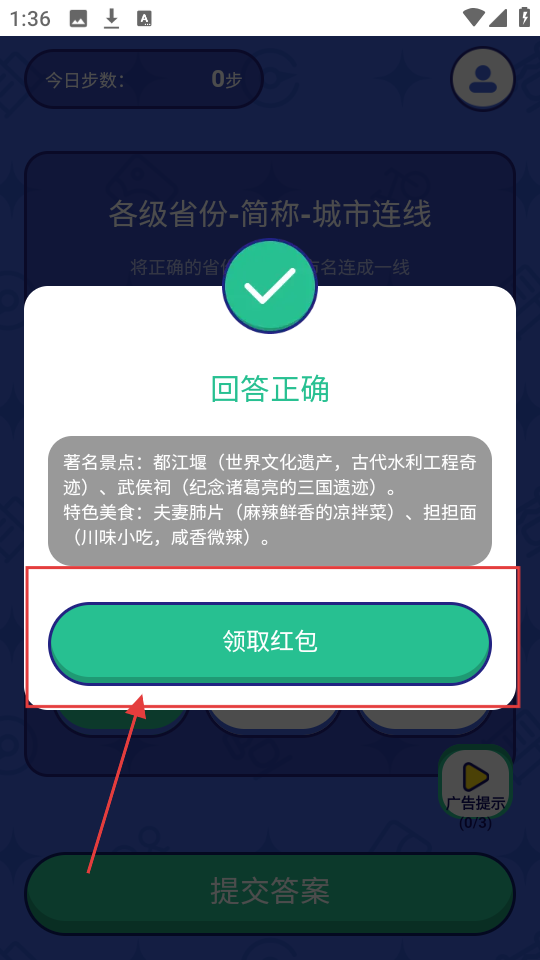 4、若回答正确,会弹出提示框,显示景点、美食等内容,点【领取红包】,获取游戏奖励。