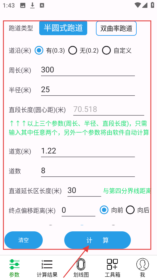 1、进入参数页,选跑道类型,设置道沿、周长等参数,填好后点【计算】,获取跑道相关计算结果。