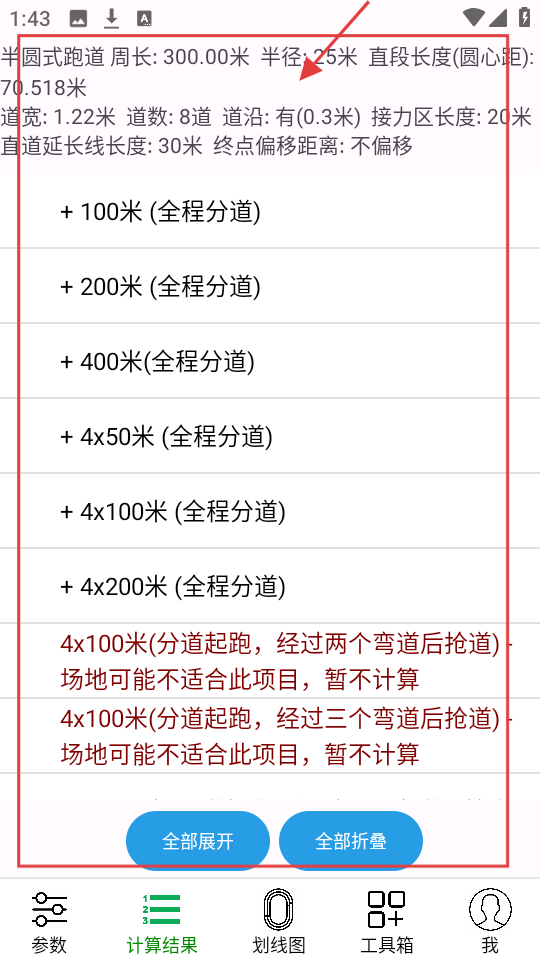 2、在计算结果页,可查看不同项目的分道情况,点【全部展开】,能看到更多项目的详细计算信息。