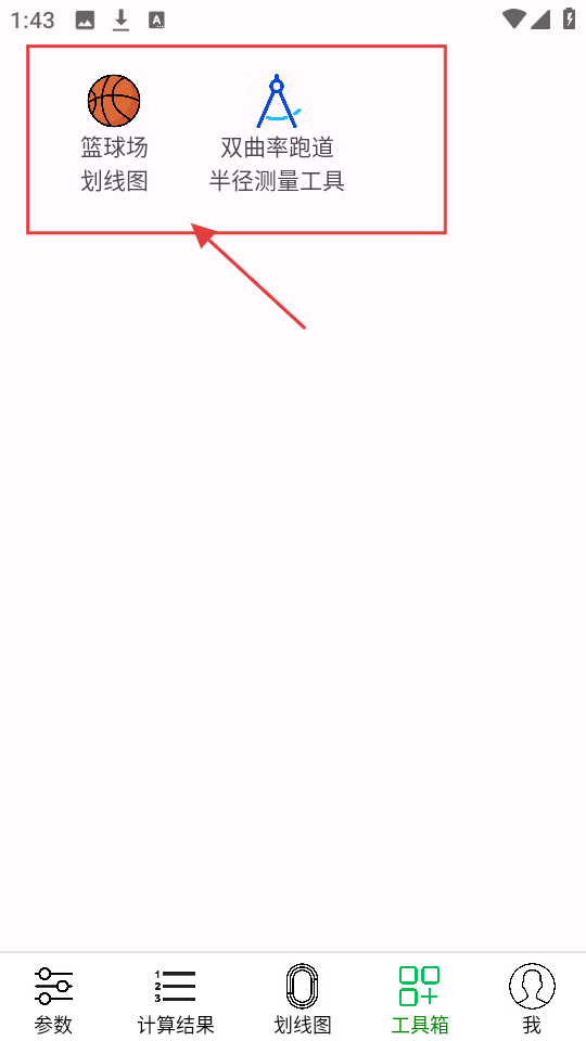 3、进入工具箱页,有【篮球场划线图】【双曲率跑道半径测量工具】,选【篮球场划线图】,查看篮球场划线详情。