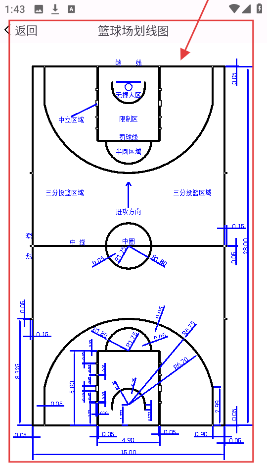 4、在篮球场划线图页,可清晰看到各区域划分及尺寸标注,借助此图,能准确进行篮球场划线操作。