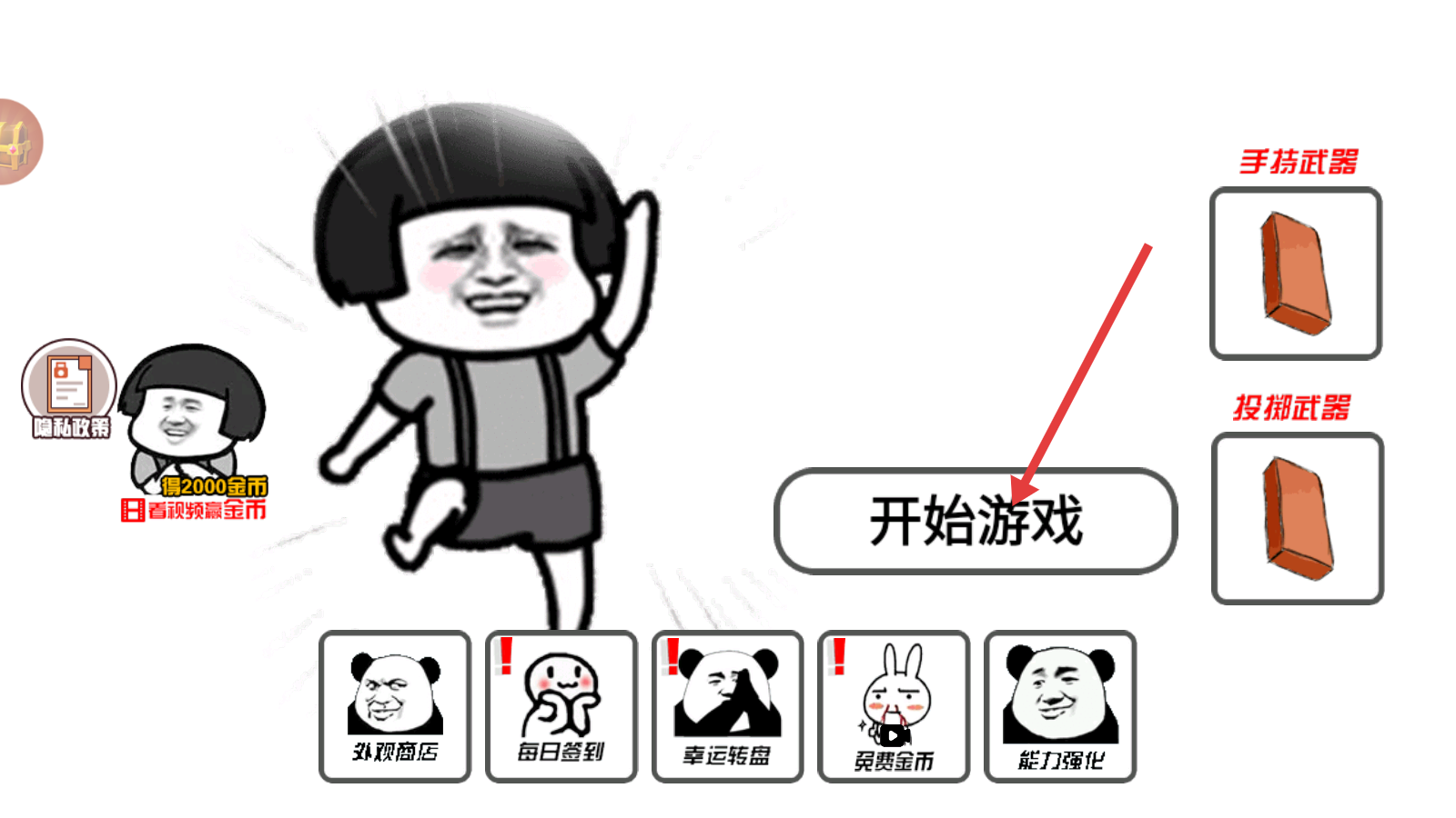 1、点击【开始游戏】,进入游戏,可选择手持或投掷武器,开启竞技对战。