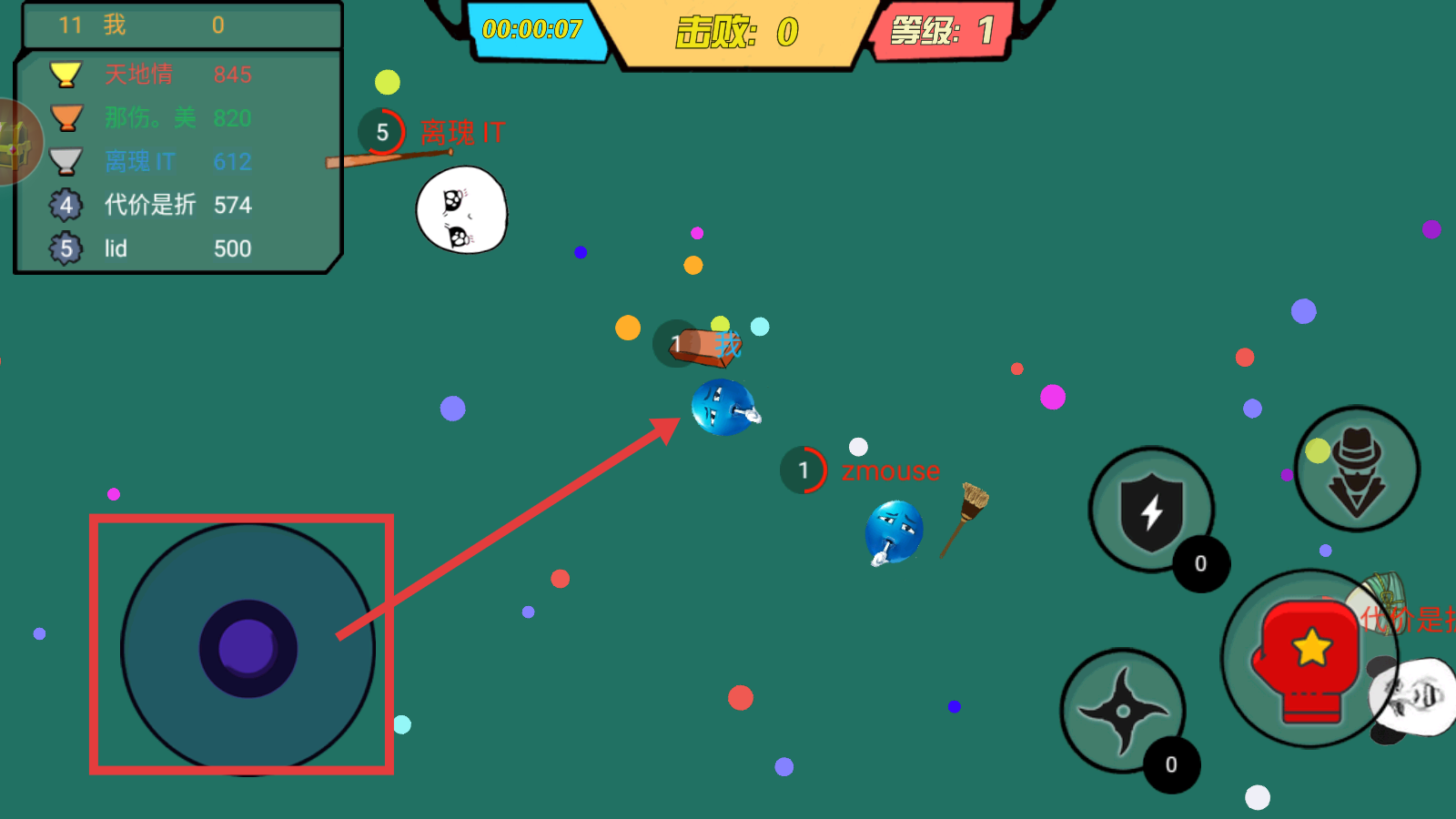 2、对战中通过左侧圆形摇杆操控角色移动,在场景中与其他玩家(如“zmouse”等)互动。