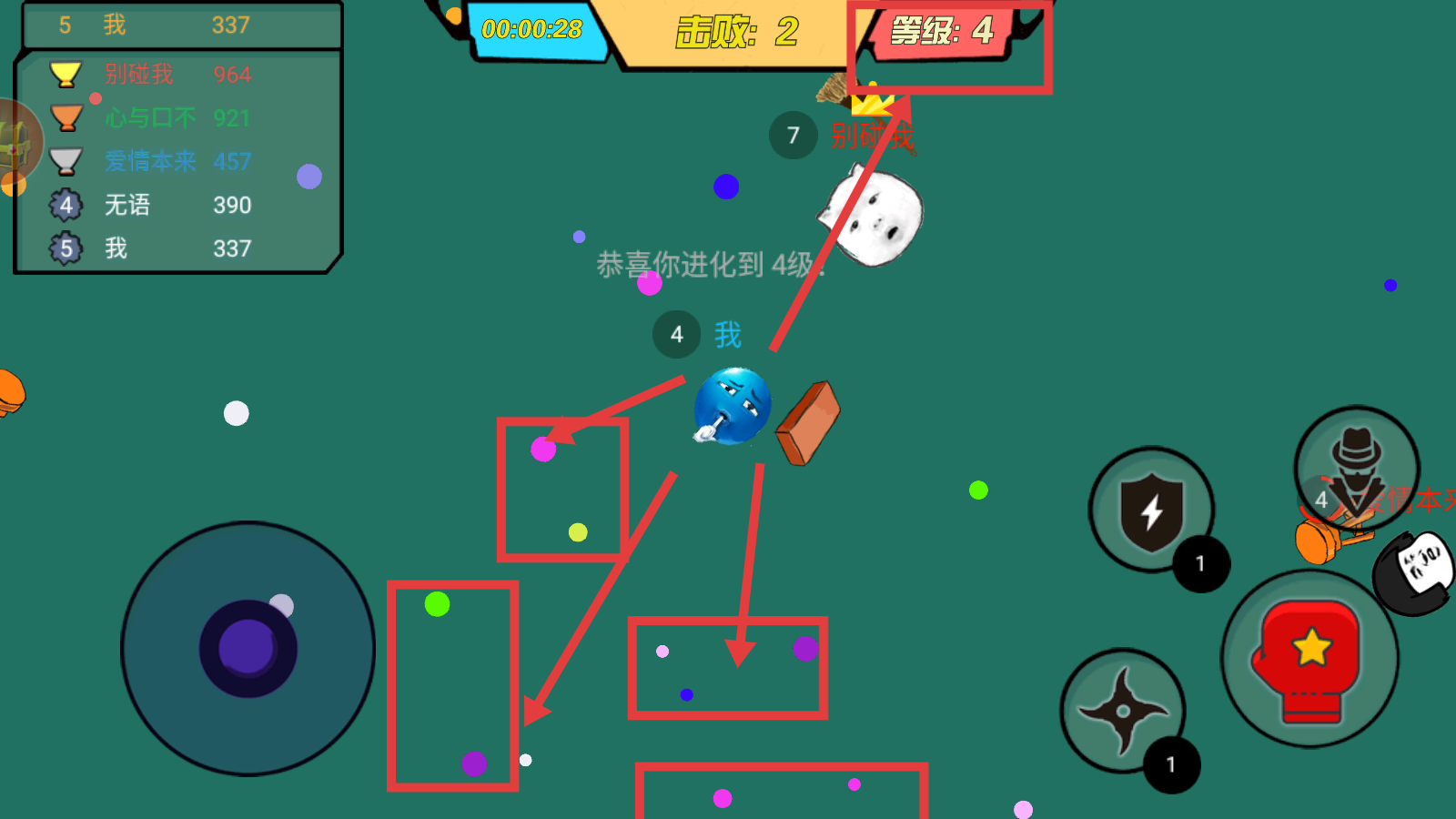 3、收集场景中的彩色光点,可提升等级(如进化到4级),增强角色能力,同时尝试击败其他玩家。