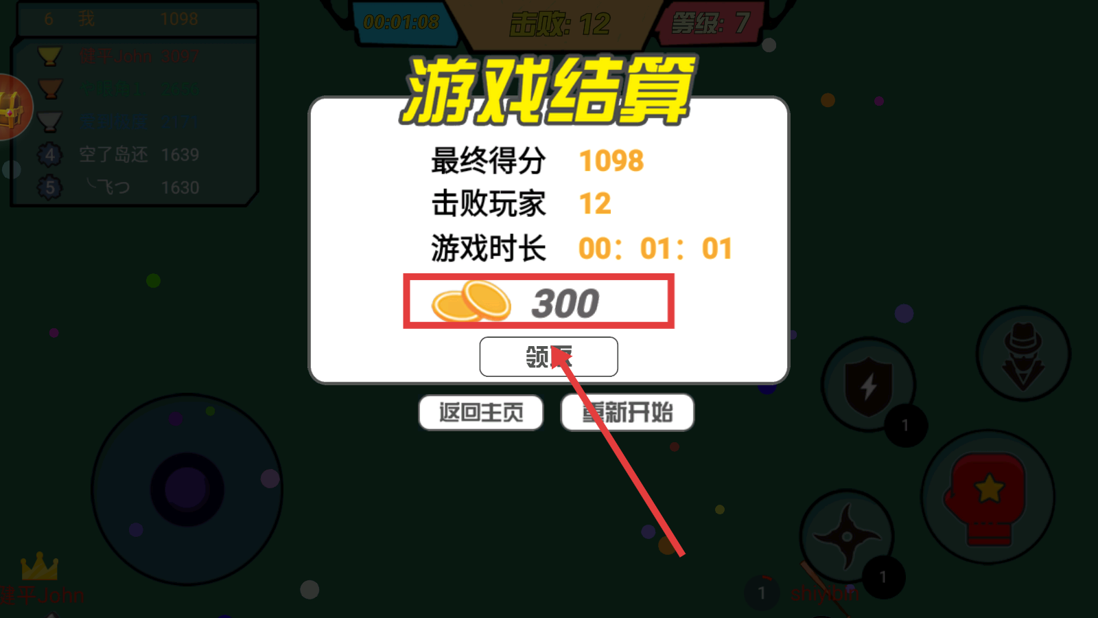 4、挑战结束后,在结算界面可领取金币奖励(如300金币),也可选择返回主页或重新开始游戏。