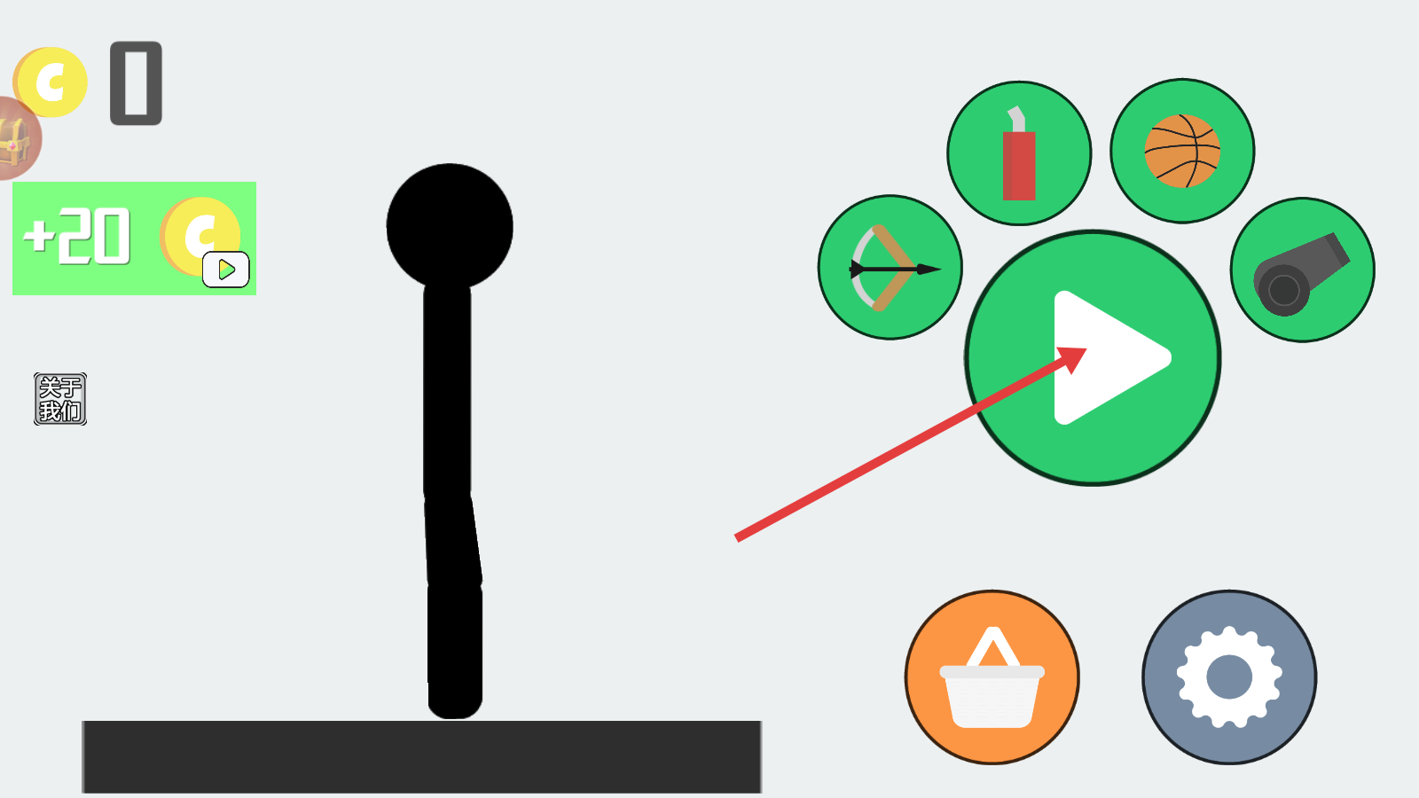 1、点击绿色播放键进入游戏,能看到火柴人角色,还可选择【弓箭】【炸药】等道具开启挑战。