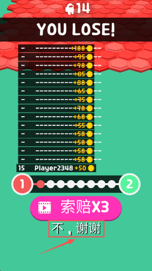 4、最后,如果游戏失败,可以选择“不,谢谢”来拒绝额外的赔付,然后重新开始。