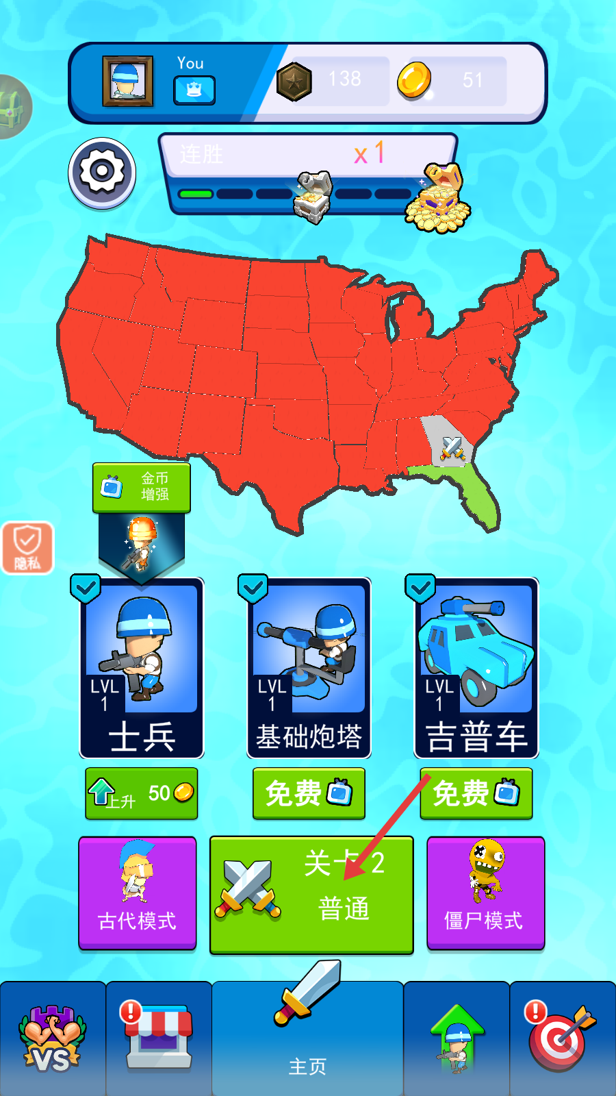 1、进入游戏后,选择【关卡2-普通】,可利用【士兵】【基础炮塔】【吉普车】等单位,开启关卡挑战。