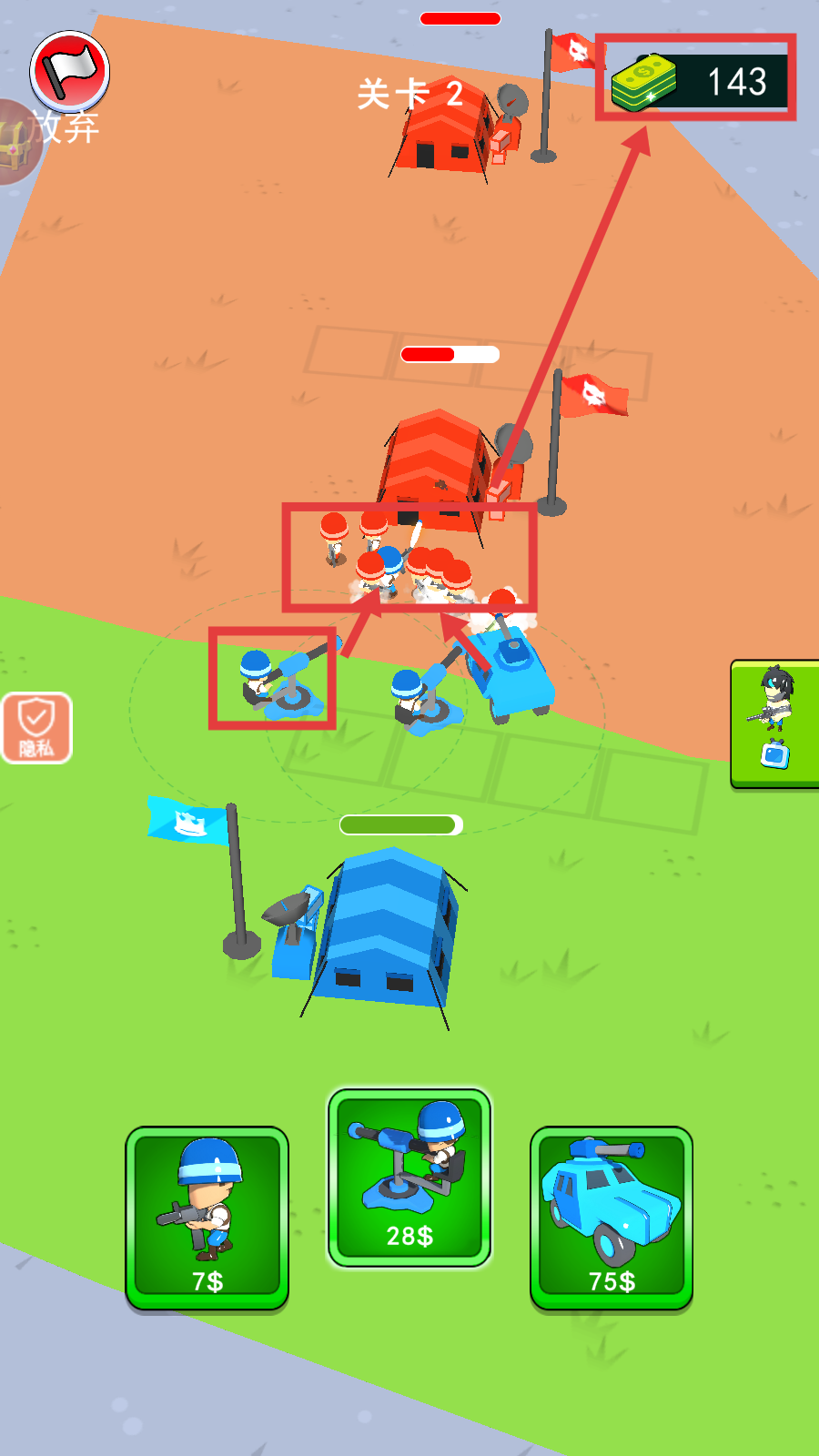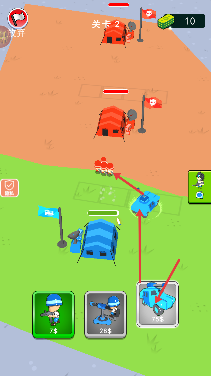2、在【关卡2】中,花费【75$】部署【吉普车】,让其配合士兵,向红色敌方营地发起进攻。
