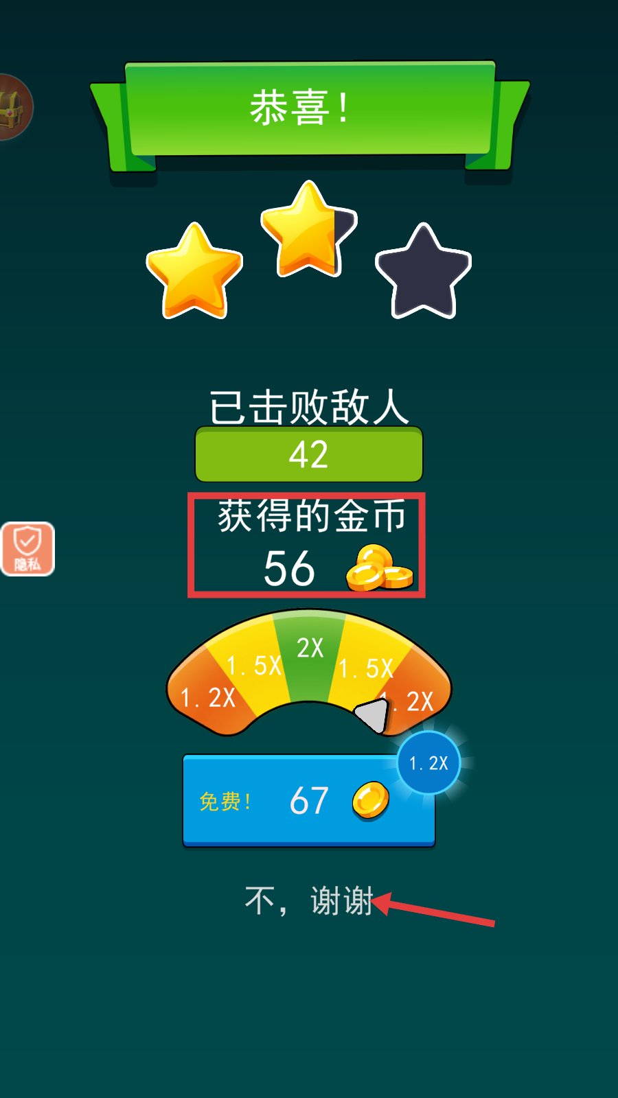 4、成功通关后,可获得【56】金币奖励,还能选择是否获取加倍金币,若不需要可点击【不,谢谢】。
